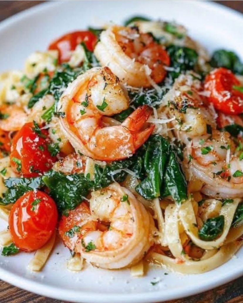 Sautéed shrimp, tomatoes, spinach cream sauce over pasta