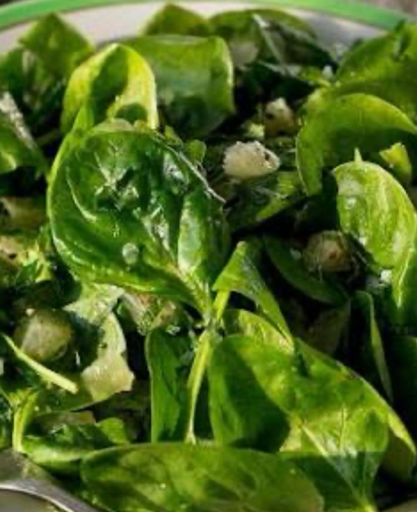 Regular size. Spinach greens with tomatoes, onions, cucumbers.