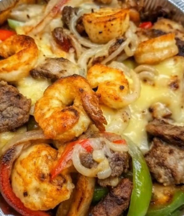 Regular pan. Cheesy steak, shrimp red peppers, and onion.